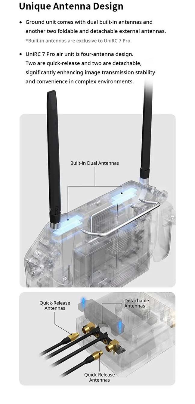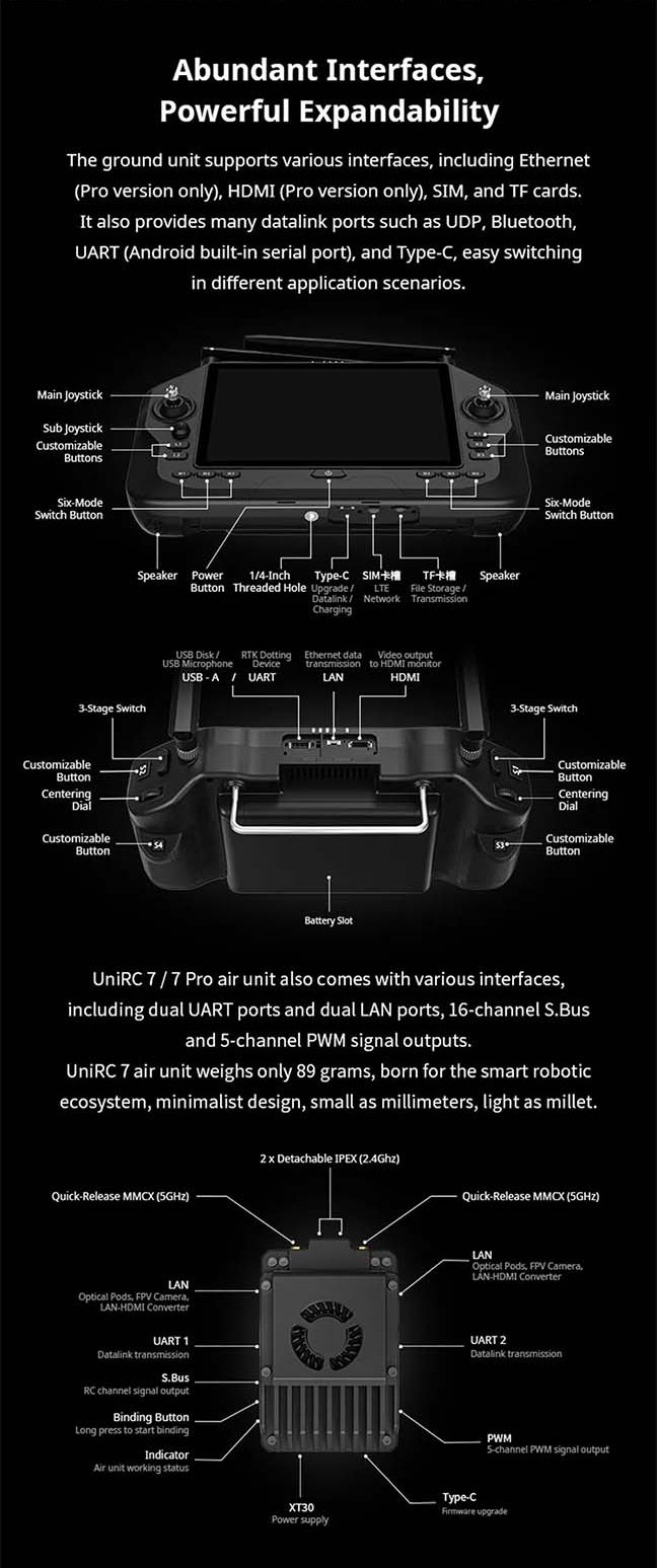 Equipped with innovative features like a unique sub-joystick for enhanced control, six customizable flight mode buttons, dual-operator capabilities, and active cooling for optimal performance, the UniRC 7/7 Pro is designed to meet the needs of professionals across diverse industries. The quick-release belly bracket and four-antenna design further enhance its stability and signal strength, making it an ideal choice for those in agricultural, surveying, and inspection fields.