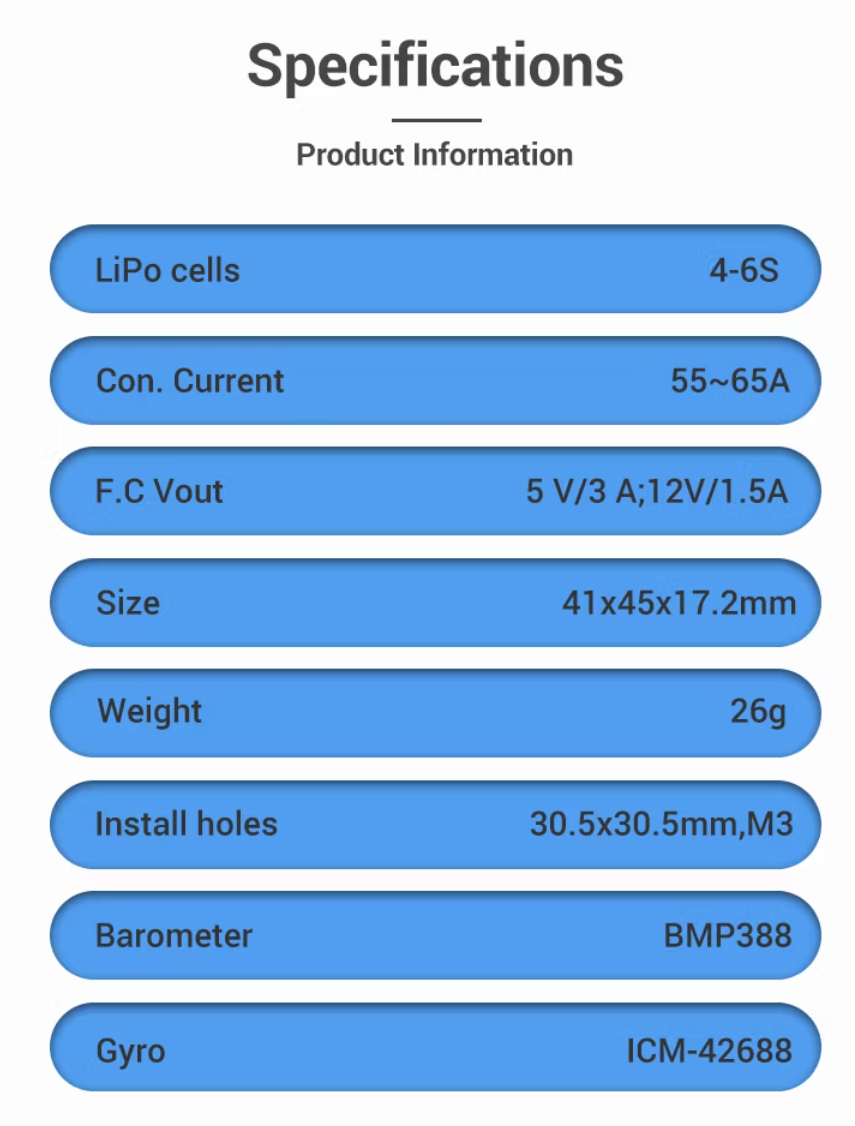 55A and 65A Flight Stacks available as well as and other 20A 30A 40A 50A 60A 80A 120A 160A 200A Flight ESCs. Please contact us for more details.