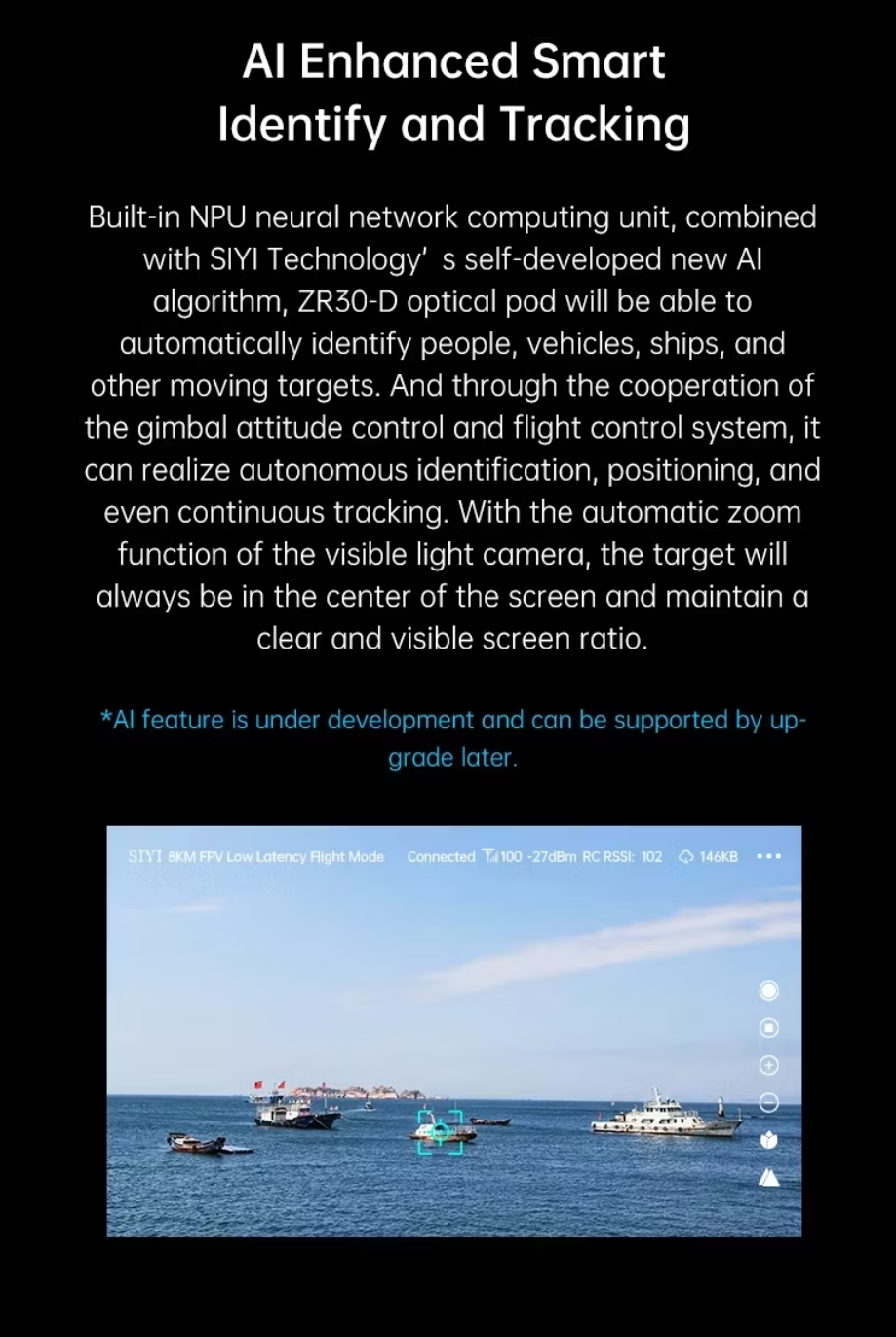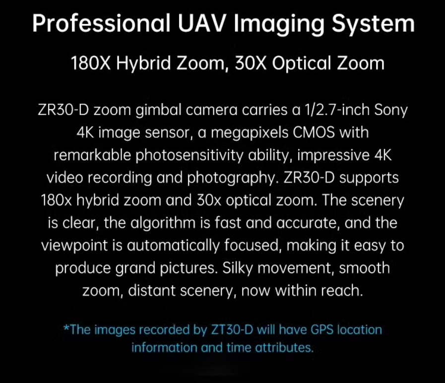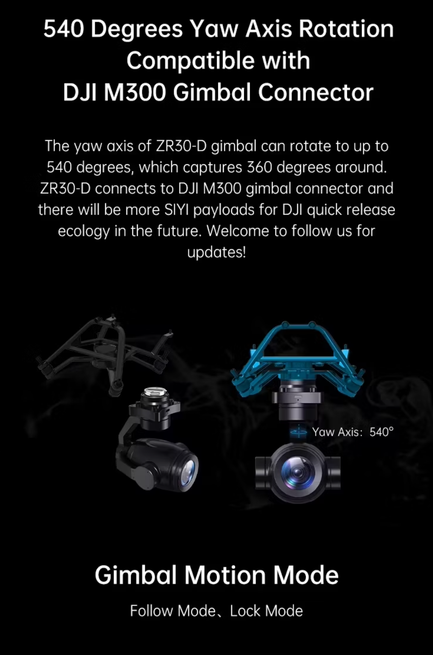 The ZR30-D is a 30x optical zoom gimbal camera developed based on the ZR30 to be compatible with the DJI Matrice 300 RTK drone. Besides brilliant features already available with the ZR30 optical pod, the ZR30-D is designed with depth integration and optinmisation to enhance the experience of using with teh M300 drone. Through the DJI pilot app, you can control the abundant features of the ZR30-D such as gimbal rotation, camera zoom and focus, video recording, photography etc.