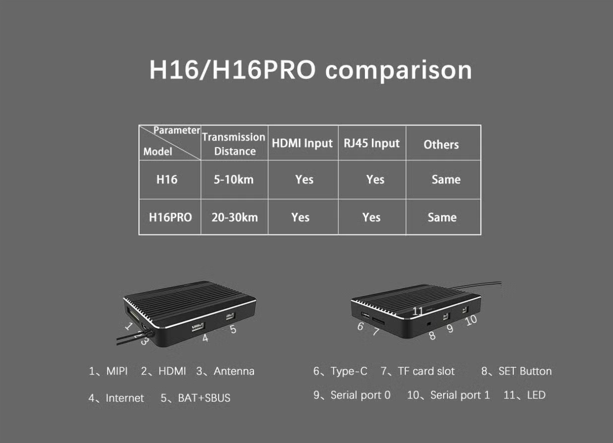 high-performance lithium battery Integrated with high energy density lithium ion battery, can work for 10-15 hours in 2 hours of charging . can work ITransmission HDMI Input RU4S Input Others Model Distance H16 5-10km No Yes Same H6PRO 20-30km Yes Yes Same 1 MIPI 2 HDMI 3 , Antenna 6 Type-C 7 TF card slot 8 SET Button Internet BAT + SBUS 9.